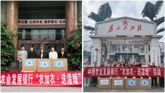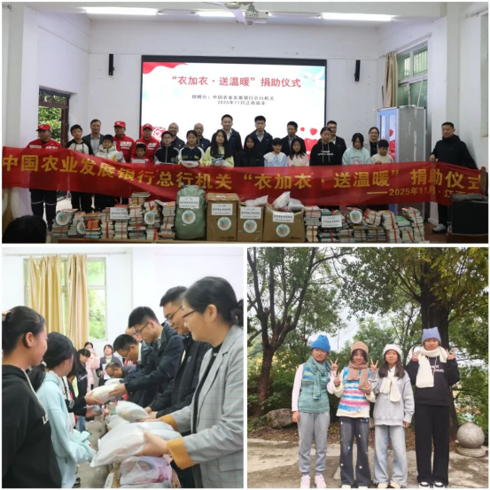 10月底,马关县定点帮扶三人小组联合马关县支行、省分行挂钩帮扶马鞍山社区举办了捐赠仪式,将募集到的冬季衣物捐赠给当地群众,送去温暖与关怀。11月4日,总行机关团委书记前往江西南丰,与当地农发行挂职干部赴三溪乡中心学校举办捐赠仪式,将募集到的书籍和公益编织作品送到孩子们的手中,用跨越万水千山的心意助力孩子们的健康成长。
