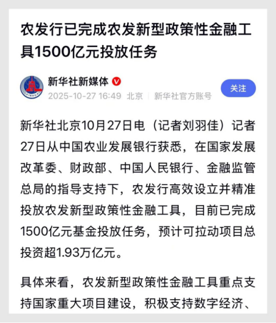 记者从中国农业发展银行了解到,在国家发展改革委、财政部、中国人民银行、金融监管总局的指导支持下,农发行高效设立并精准投放农发新型政策性金融工具,目前已完成1500亿元基金投放任务,预计可拉动项目总投资超1.93万亿元。(中央电视台《朝闻天下》2025年10月28日)