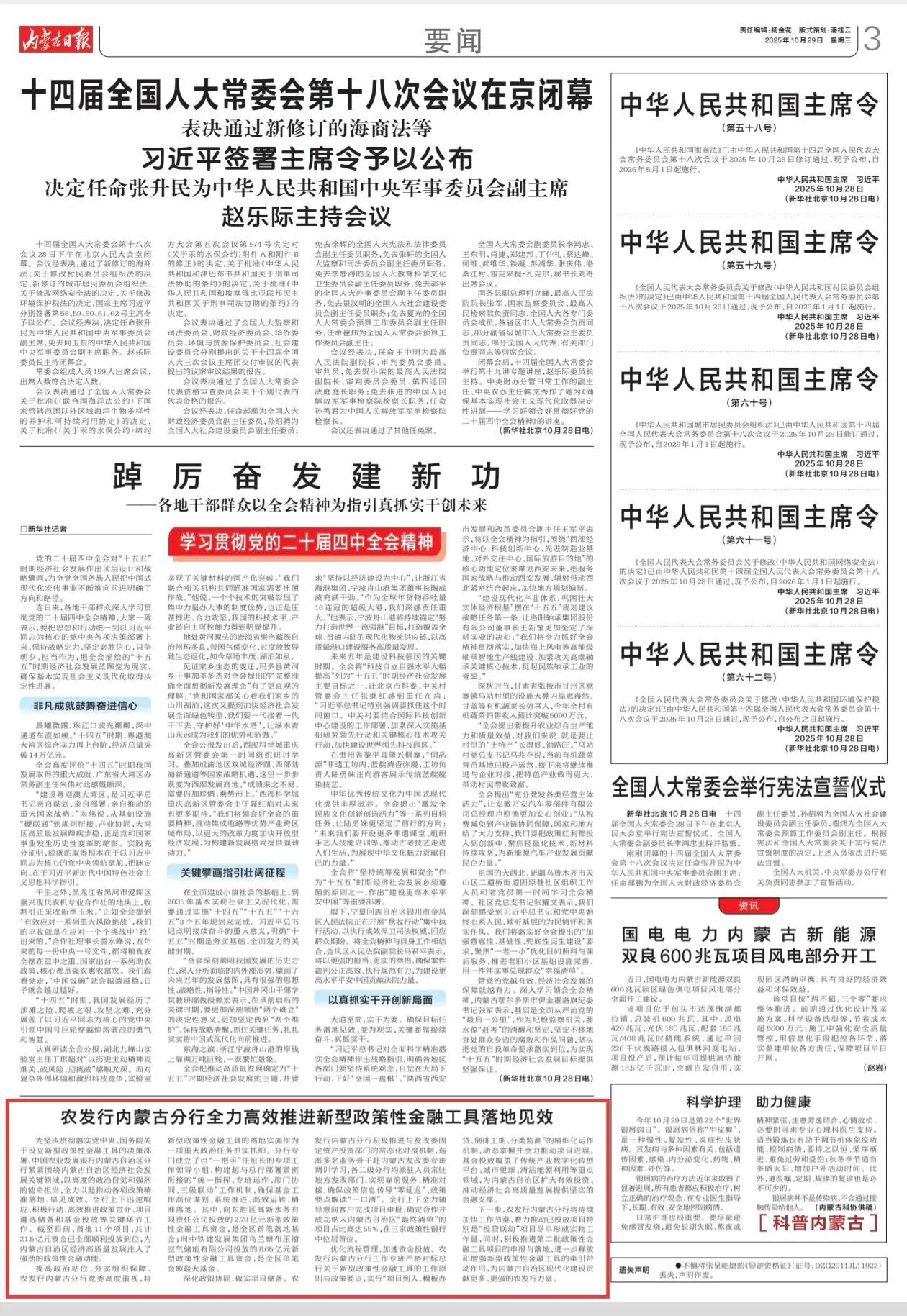 2、内蒙古自治区分行:内蒙古日报《农发行内蒙古分行全力高效推进新型政策性金融工具落地见效》
