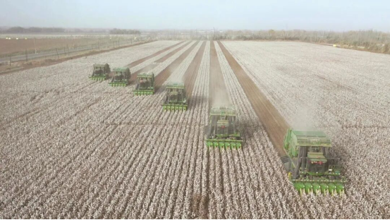 新疆维吾尔自治区巴音郭楞蒙古自治州尉犁县高标准棉田机械化收割场景 农发行供图